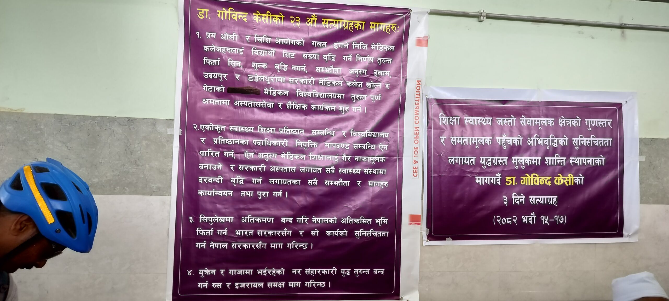 अत्तरियाः चिकित्सा शिक्षा सुधारका अभियन्ता प्रा.डा. गोविन्द केसी पुनः सत्याग्रहमा उत्रिएका छन्। सरकारले निजी मेडिकल कलेजलाई सिट वृद्धि दिने निर्णय गरेको विरोधमा उनले आइतबार (भदौ १५) देखि तीन दिने सत्याग्रह सुरु गरेका हुन्।
